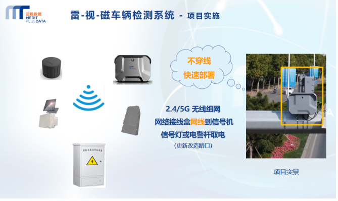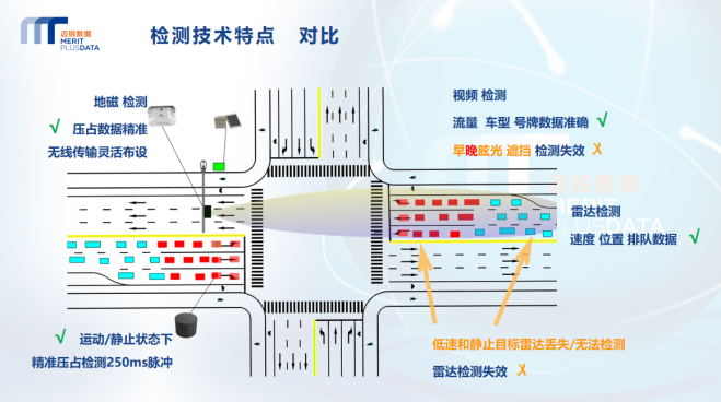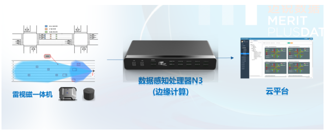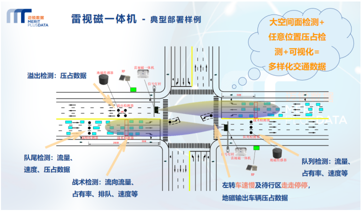 雷视磁一体机的典型部署方案如下,在城市道路十字交叉口,首先将雷视磁一体机安装在信号灯杆上,正向面对来车方向,可以检测正面的阴影投射区域的目标车辆,输出流向流量、排队和速度等指标,在阴影投射区域外需要检测的位置,布设地磁检测器,如发生溢出方向、远离雷视的队尾处车辆压占检测,以及出口处的队列检测等。通过多种检测方式融合,真正实现大空间面检测、任意位置压占检测和可视化展示,输出满足信号系统需求的多样化交通数据。